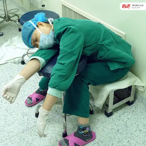 医生在手术台上,经常一站就是好几个小时,甚至十几个小时、几十个小时,不吃不喝,想尿不能尿,以致有的外科医生早晨不敢多喝水。加上手术台上高度紧张,手术结束后突然松弛,更容易疲劳。图为2004年9月26日深夜3点的一台大手术,刚刚换下台的医生极度疲惫,只能坐在踏脚凳上靠墙稍事休息。在整个手术没有结束之前,所有医生不能离开手术室。