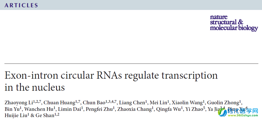 Li Z, Huang C, Bao C, Chen L, Lin M, Wang X, Zhong G, Yu B, Hu W, Dai L, Zhu P, Chang Z, Wu Q, Zhao Y, Jia Y, Xu P, Liu H, Shan G. Exon-intron circular RNAs regulate transcription in the nucleus. Nat Struct Mol Biol. 2015,256-64.