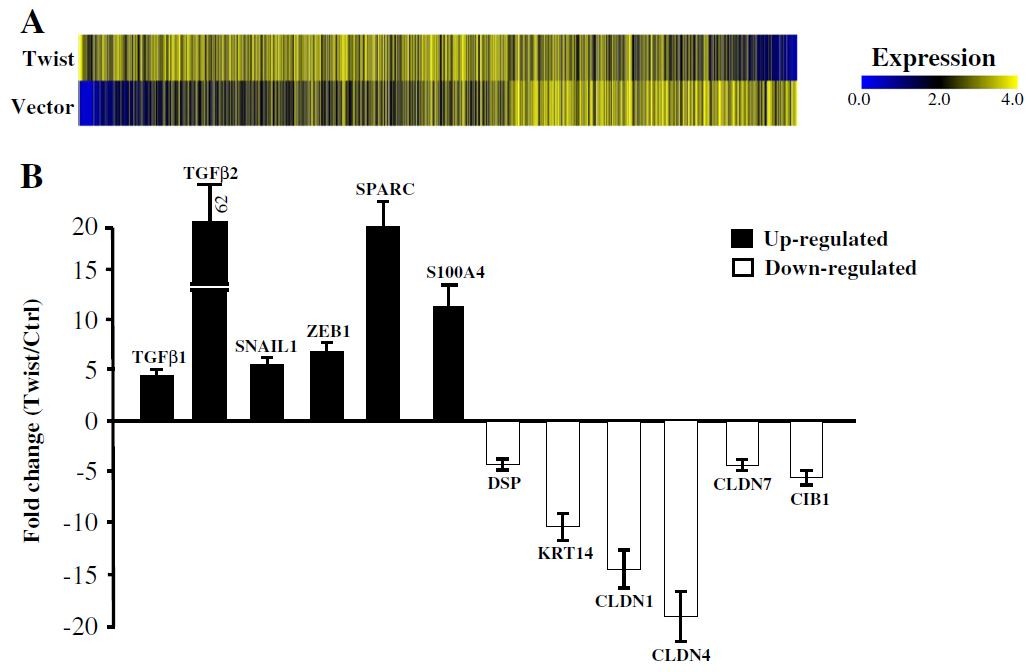 乳腺癌是一种常见的肿瘤,同时,乳腺癌也是一种极易复发和发生转移的恶性肿瘤。上皮细胞到间质细胞的转化(EMT),是发生肿瘤转移的重要因素之一。现有研究表明,EMT过程是一个受到多种转录因子调控的复杂网络。Twist,一种b-HLH转录因子,通过下调E-cadherin,对细胞的运动和侵袭起到非常重要的调控作用。临床数据也表明,Twist在肿瘤中的异常表达伴随着不良的生存率。有关EMT过程中,Twist是如何调控下游因子,特别是长链非编码RNA的作用目前还不是非常清楚。该研究利用高通量lncRNA芯片筛选,找到了肿瘤细胞迁移相关转录因子Twist诱导的EMT过程相关lncRNA和mRNA,为我们理解肿瘤转移过程中,Twist通过影响lncRNA而调控EMT过程提供了理论基础。