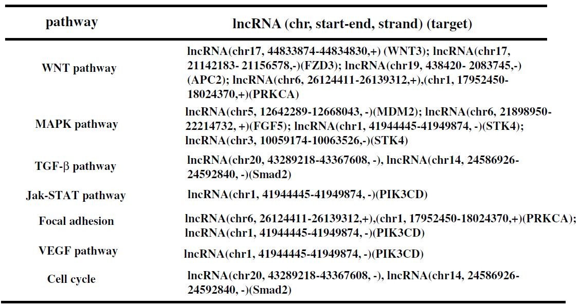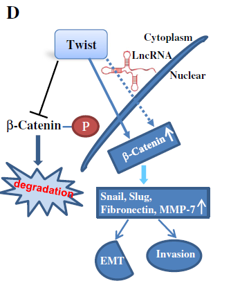 为了更好的筛选下游调控的lncRNA,研究人员对芯片差异lncRNA进行了cis和trans预测,结合芯片差异表达mRNA筛选到421个潜在lncRNA调控mRNA。DAVID分析显示WNT, MAPK, JAK/STAT, TGF-β, mTOR, Hedgehog and P53 signaling pathways显著富集。其中,WNT pathway和focal adhesion pathway受lncRNA(chr6, 26124411-26139312, +)调控,JAK-STAT pathway, focal adhesion pathway, 和 VEGF pathway由lncRNA (chr1, 41944445-41949874, ?)调控。WNT pathway是lncRNA(WNT3,FZD3,APC2等)的调控通路,MAPK pathway是lncRNA(MDM2,FGF5)的调控通路。该结果表明Twist通过影响下游lncRNA的表达影响了一系列的信号通路而调控EMT过程。