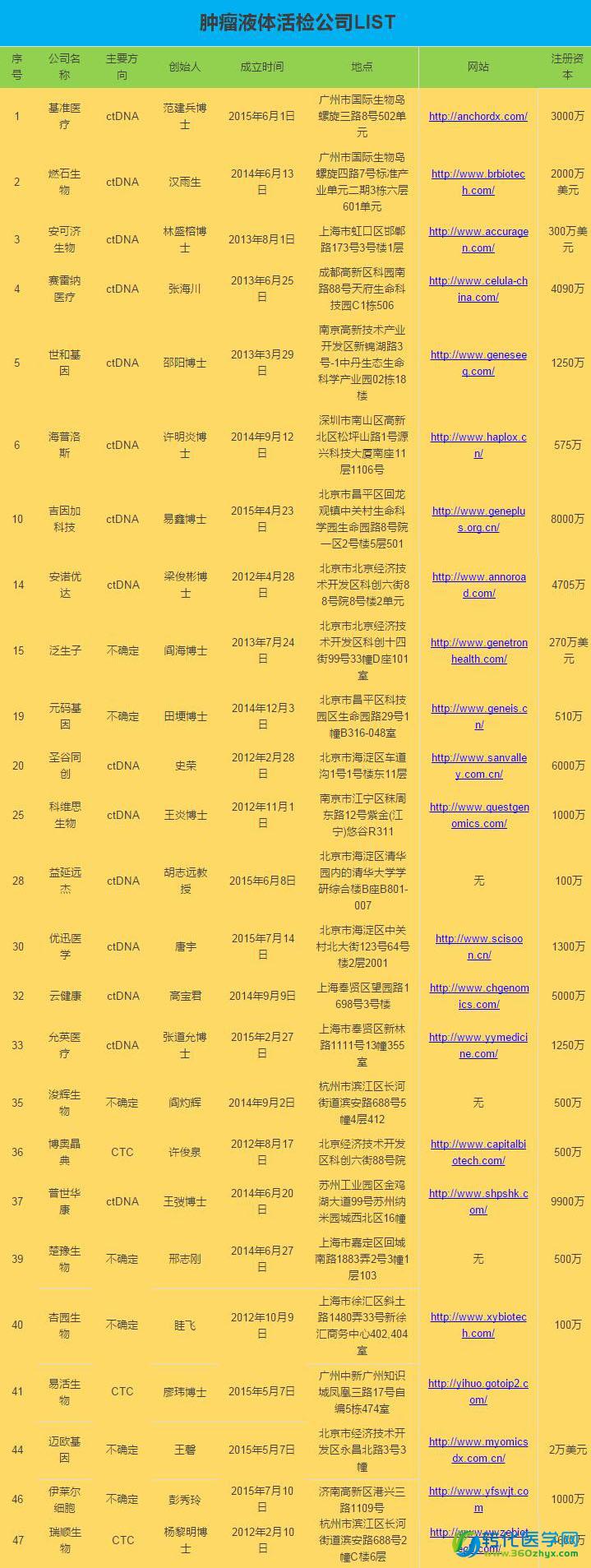 1、有47家公司在做肿瘤液体活检,四个一线城市北京(15家,占32%)、上海(12家,占25%)、广州(7家,占15%)、深圳(2家,占4%)总共36家,占75%;
