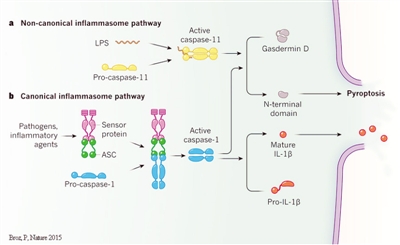 细胞炎性坏死(细胞焦亡,pyroptosis)是机体的重要免疫防御反应,在清除病原感染和内源危险信号中均发挥重要作用。细胞焦亡由炎性蛋白酶caspase(caspase-1和caspase-4/5/11)介导,但具体机制完全不清楚。北京生命科学研究所邵峰团队和厦门大学韩家淮团队分别独立鉴定出全新的GSDMD蛋白,并证明GSDMD是所有炎性caspase的共有底物,其切割对于caspase激活细胞焦亡既是必要的也是充分的。这些工作揭示细胞焦亡的关键分子机制,为多种自身炎症性疾病和内毒素诱导的败血症提供了全新的药物靶点。邵峰和韩家淮论文分布在《Nature》(2015年10月)和《Cell Research》(2015年12月)上发表。