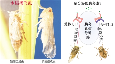 昆虫长、短翅可变发育是生物发育可塑性的典型例子,是昆虫进化成功的重要特性。稻飞虱是水稻的最重要害虫,若虫可以根据环境条件变化,选择性地发育为能飞行的长翅型成虫,或发育为不能飞行但繁殖更强的短翅型,这种可塑性发育是该虫成为毁灭性大害虫的重要原因。浙江大学张传溪教授带领的团队研究发现,稻飞虱翅芽的两个胰岛素受体在长、短翅分化中作用相反,起着分子“开关”作用。抑制胰岛素受体I基因和胰岛素通路会导致转录因子FOXO进入细胞核,若虫就发育为短翅型成虫;而抑制在翅芽组织中特异表达的胰岛素受体II基因就会导致FOXO滞留于翅芽的细胞质,若虫就发育为长翅型成虫。本研究成果在2015年3月《Nature》杂志上发表,被认为“是多型现象分子机理研究的一个里程碑”,在稻飞虱防治上具有重要价值。