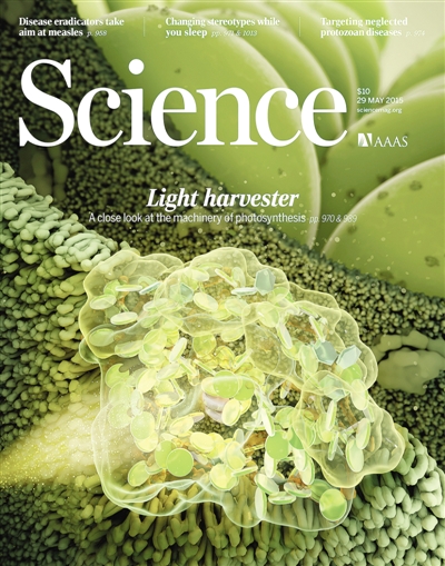 光系统I(PSI)光合膜蛋白超分子复合物是光合作用中高效吸能、传能和转能的系统,其量子转化效率几乎为100%。中国科学院植物研究所匡廷云、沈建仁研究团队在原子水平分辨率的高等植物光系统I-捕光天线(PSI-LHCI)晶体结构,解析了高等植物PSI-LHCI的精细结构,其中包括16个蛋白亚基和205个辅因子,总分子量约600kDa;揭示光系统I的4个捕光色素蛋白复合体(Lhca1-4)在天然状态下的结构及相互关系,LHCI全新的色素网络系统和LHCI红叶绿素的结构,明确提出LHCI向核心能量传递可能的4条途径。该研究成果对于阐明光合作用机理及提高作物光能利用效率和开辟太阳能利用的新途径都具有重要的理论和实践意义。该研究成果在2015年5月《Science》期刊以长文的形式并作为封面文章发表。