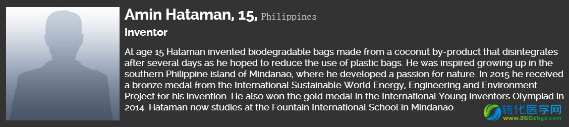 作为一位15岁的发明家,Hataman发明了生物降解包,他的发明能够在几天之内把塑料袋完全降解。2015年,Hataman获得了来自国际可持续发展世界能源协会的铜奖。