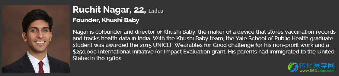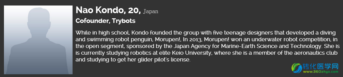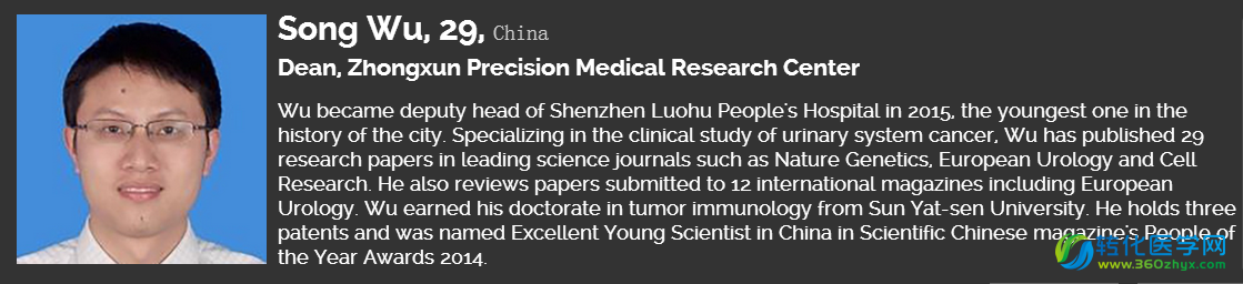 2016年2月25日《福布斯》杂志公布了一份“30位30岁以下亚洲人物榜”(Forbes 30 Under 30 Asia)。这是福布斯第一次由美国总部发起,以亚洲作为评选范围的评选的榜单,囊括了科学、媒体、娱乐等十个领域内30岁以下的创新者和领军人物。转化医学网整理了生命科学领域的30位精英名单: