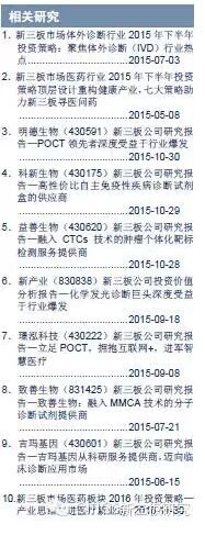 分子诊断行业上下游的服务提供商。吉玛基因销售多品类生物化学试剂,并通过为科研单位提供研究外包服务,为公司带来稳定现金流。2015年上半年公司收入为1939万元,同比增15.85%;扣非后净利润由2014上半年的0元增至3844.08元。公司新研分子诊断试剂盒可针对多种肿瘤和免疫系统疾病做出诊断并可指导临床用药。现已完成临床前期实验,正在申请药证,预计2017年投放市场。