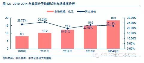 看好精准诊断行业的发展前景。我国体外诊断产品市场规模在全球体外诊断产品占比仅为4.2%。2010年,我国体外诊断产品市场规模为122亿元。考虑到我国人口占全球人口比重达20%的数据,我们认为我国体外诊断市场总量偏低,未来市场增速可期。从2010年开始,我国体外诊断行业市场规模从122亿元,快速增长至2013年的215亿元,复合增长率达20.79%。伴随着人口老龄化、医药改革、政府合理引导规范市场、中产阶级需求提高等积极因素,预计我国体外诊断市场的供给在未来4年中将依旧维持超过20%的增速。体外诊断行业中分子诊断因其更贴近DNA水平,从而可获得贴合疾病生理状态的信息,可适用于多项肿瘤指标、急诊适应症的筛查,有助于医生精准针对不同基因型病人开处不同耐受、吸收和疗效程度的药物,未来具有爆发式增长潜力。