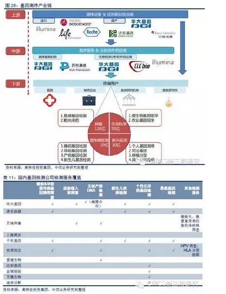 基因检测应用范围广,中游检测服务企业通过技术集成占有产业链核心环节。基因测序可应用于肿瘤检测、遗传病检测等多方面。根据Illumina的测算,未来基因检测在肿瘤应用领域市场规模将达到120亿美元,占比60%;婚前、孕前、产前及新生儿基因检测的市场规模可达20亿美元,占比为10%。在整个基因测序产业链中,处于中游的测序服务提供商将凭借其独有的技术获取产业链核心环节。现阶段,测序服务企业主要有Illumina、Roche、Pacific、Lifetech、华大基因、达安基因及贝瑞和康等公司,国内的医院、研究机构、药企等基因测序服务市场基本被有技术和成本优势的贝瑞和康、安诺优达等少数企业所占据。