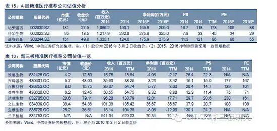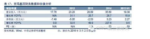 估值分析。我们选取A股体分子断行业作为估值参考,截至2016年3月2日,现可比公司平均市值125.2亿元,2015年PE为111X。吉玛基因市值5.7亿元。