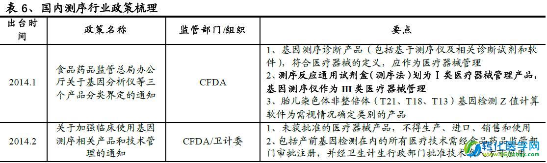 2014年2月国家卫计委、CFDA联合叫停基因检测,相关部门出台文件明确了基因测序行业的双重监管属性,所用的仪器设备归口CFDA报批管理,临床领域的使用归口卫计委或属地管理。3月份卫计委随即出台了《关于开展高通量基因测序技术临床应用试点单位申报工作的通知》,拉开了基因测序行业临床应用规范化的大幕。