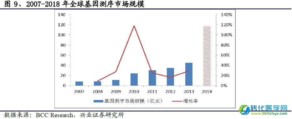根据BCC Research数据统计,随着测序成本呈现几何级别下降和商业化的逐步推进,全球基因测序市场规模从2007年的7.94亿美元增长至2013年约45亿美元,年复合增长率达到33.5%,预计未来几年将保持21.1%的复合增速,在2018年达到近117 亿美元的规模,未来5年将有1-2倍的发展空间。