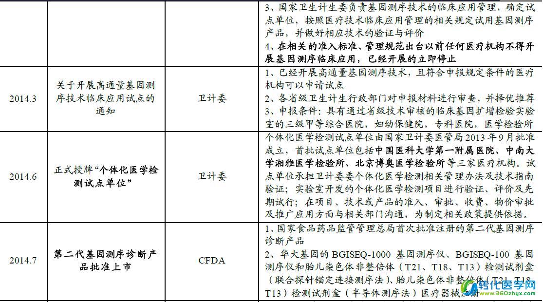随后,从2014年6月到2015年3月不到一年时间,CFDA先后批准华大基因、达安基因等公司的测序仪和测序产品,卫计委先后正式授牌“个体化医学检测试点单位”(3家),确定首批高通量测序技术临床应用试点单位(7家),其中包括5家第三方医学检验所华大、达安、博奥、安诺优达和爱普益,同时陆续公布了临床应用首批四大领域:遗传病诊断、产前筛查与诊断、植入前胚胎遗传学诊断、肿瘤诊断与治疗。