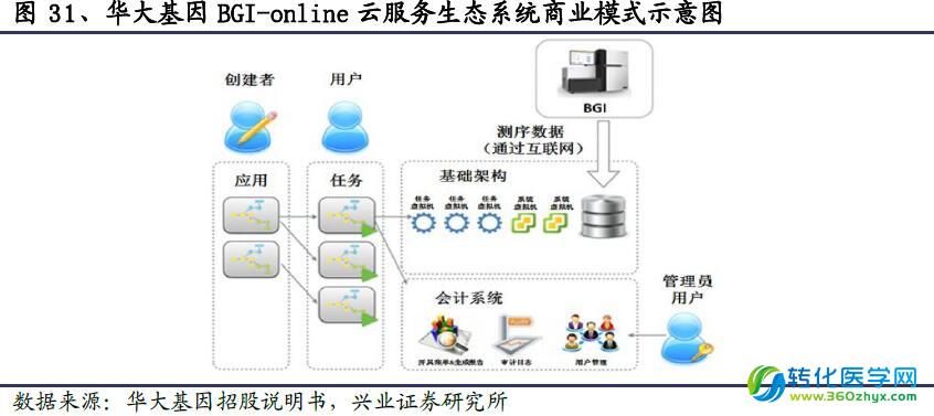 多方面诉求促进云平台对接:一方面,NGS使单个实验室能在合理的成本范围内就可以产生TB、PB级的数据量,但许多测序公司或实验室并不具备储存和处理这些大规模数据的服务器设备。另一方面,计算大规模数据集最重要的是分析算法的并行化,有效解决大数据运算的方法是将任务分配给若干计算机处理器同时计算,针对不同算法可以进行不同类型的并行化运算,通过不同的计算平台来获得最佳性能。从以上可以看出,NGS数据分析解读面临着数据量大、数据处理过程复杂、对计算资源要求高的潜在需求,而云计算提供了一种有效的解决方案,云架构下的平台搭建,存储、计算软件开发和工作流框架正在不断完善和发展。从国内来看,华大基因在这方面布局较早,处于行业领先地位。