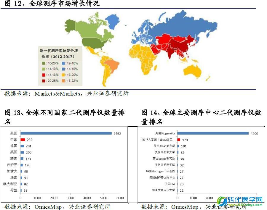 从全球市场来看,北美地区测序市场份额最大,这主要得益于Illumina和Life Technologies两大测序仪供应商的销售,以及该区域NGS技术与个性化医疗和伴随诊断同时发展,同属资本密集及高研发投资领域。美国临床测序技术在肿瘤以及传染病领域应用居多,预计未来美国仍将是NGS市场的引领者。