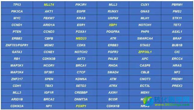 该研究找到的93个基因,黄色高亮的为与乳腺癌相关的新基因,其他的基因发生突变也可能导致乳腺癌的发生
