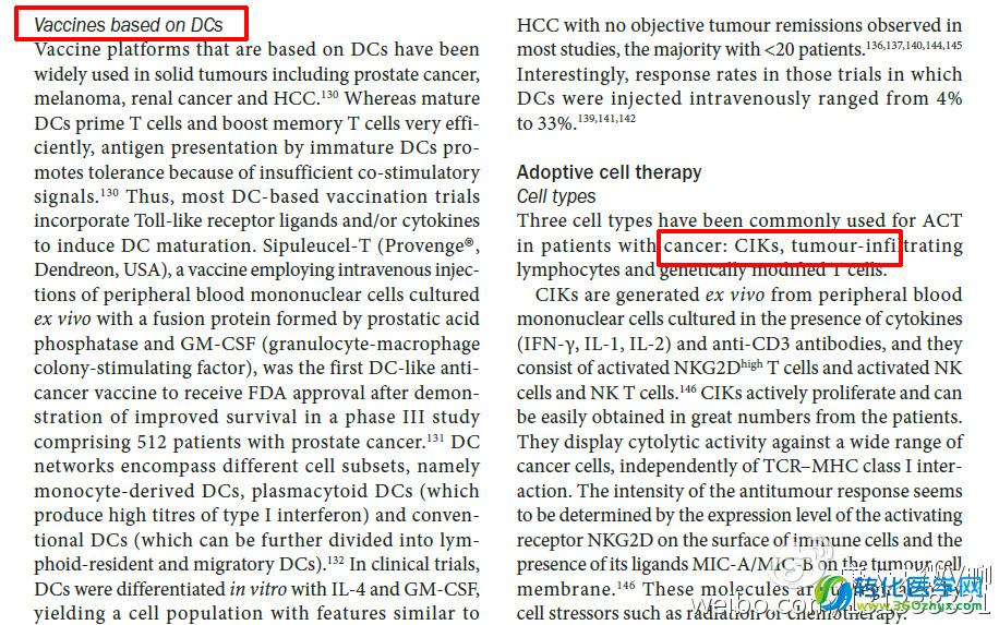 首先简单介绍一下概念。这里用于治疗的所谓DC是指负载肿瘤抗原的树突状细胞,CIK是细胞因子诱导的杀伤细胞。DC-CIK的基本原理是这样的:通俗的讲,肿瘤患者体内存在所谓“正”、“邪”之争,“邪”即肿瘤本身,“正”即抗肿瘤免疫。肿瘤之所以会发生并进展,是因为“正不胜邪”,也就是抗肿瘤免疫反应太弱而不足以控制肿瘤。DC-CIK技术就是把机体免疫细胞分离到体外,通过一定的技术手段将免疫细胞数量呈指数级扩增,然后回输体内,以达到强化抗肿瘤免疫反应的目的。那么,DC-CIK是不是骗人的呢?国外有没有医院开展这项技术?当然,我没有调查过这项技术在国外开展的情况,无法给出直接数据,但有两点可以肯定:1.以我的免疫学知识来看,DC-CIK技术并非无中生有,它在免疫学理论上是成立的,当然临床是否有效及效果如何还需要临床实验的谨慎评价;2.学术界对于这项技术大多数是呈正面态度的,争论点是在于它在临床上是否有普遍作用及作用的大小(当然这种“粗线条”的免疫治疗不可能作用太大),比如2015年《自然》杂志旗下的 自然综述:胃肠病学和肝病学,发表的一篇关于肝细胞癌的较新的免疫治疗综述,也用较大的篇幅详解了DC和CIK治疗,这种文章并不鲜见。如下: