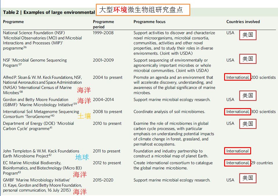 我们先来看看人类微生物组计划,截止到今年,国际上较大型的人类微生物组研究项目有13项,其中有8项正在实施,有5项已经完成。在这些大型目中,美国,加拿大,爱尔兰和法国是主要的参与国家,当然,这里面也包括至少两项中国参与的项目,分别是MetaHIT和IHMC。美国是绝对的引领者,至少有2项是美国独立开展的,最早的一项HMP也是美国开展的,总计有4项都有美国参与。加拿大后来居上,自己主导的项目至少有四项(见上图)。环境微生物组:美国挑大梁,各国跟着玩
