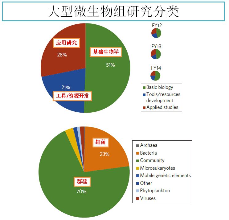 在所有这些项目中,超过一半的项目属于基础生物学研究,其次是应用研究,工具和资源开发占据了不足三分之一。可以看出,目前的微生物组研究更多的是一些基础研究,应该说我们对这些微生物的认识还比较肤浅,仍需要大量的基础研究工作来破解微生物与人类,与环境的秘密。当然,应用研究也并不落后太多,这可能得益于益生菌和益生元相关研究,因为这些研究是早于人体微生物研究的。此外,在所有项目中,研究微生物群落的项目占据了绝对多数,细菌紧随其后,说明微生物组确实是一个组,并不仅是一类微生物,而是一个群体,里面包括了古细菌,细菌,真菌,原生动物,病毒等各种微生物。从这十四个政府组织参与的微生物组项目中,你是否看出了一些什么门道?总体来看,各国都在加紧制定符合本国经济利益的微生物组项目。项目的目标设定都比较宏观和长远,国际化合作项目越来越多,并且精细化,专业化项目也越来越多。其中,在计算生物学和生物信息学、参考数据库和生物资源库、标准化的协议和工具等方面是微生物组研究的重点。纵向和功能性的微生物组研究,以及跨学科研究也越来越受欢迎。