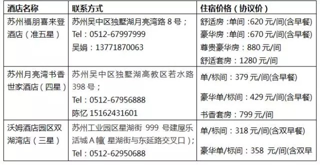 3、本次会议不再统一安排住宿,仅为参会人员提供会议举办地周边酒店信息,请参会人员自行选择、安排,费用自理。与酒店联系时需报“苏州博瑞”方可享受协议价。6月19日-20日会议期间,会务组将通过交通车环形接送参会代表,途经三家酒店。