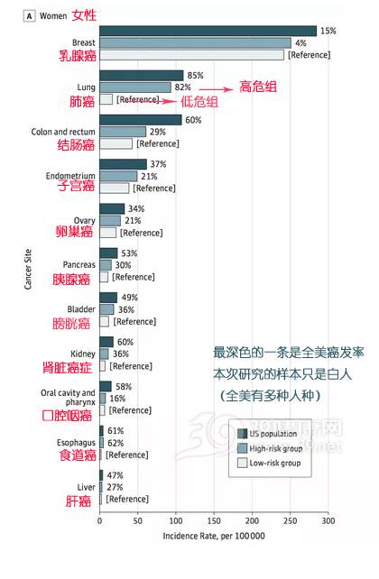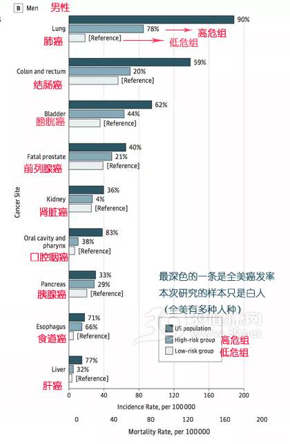 从上边的图表可以看到,研究样本人群里,高危人群的常见癌症的发病率都明显高于低危人群。特别是肺癌、结肠癌、口腔咽喉癌症这些消化道系统。