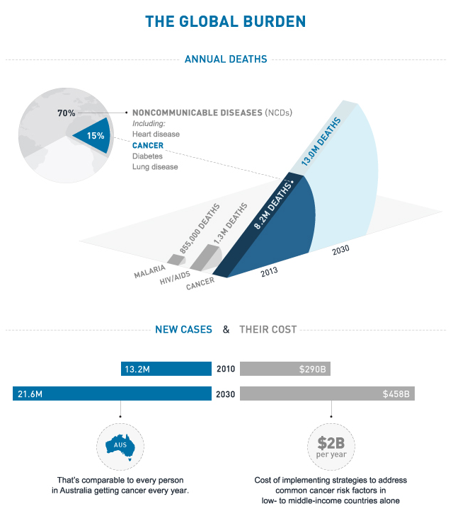 2012年,死于心脏病、肺病、糖尿病以及癌症等非传染性疾病(NCDs)的人数已经上升至全球年死亡人数的70%。每年全球单纯癌症死亡人数高达800多万,占全球死亡人数15%,与全球疟疾与艾滋病死亡人数相形见绌。跟据预计,2030年全球癌症年死亡人数将上甚至1300万。