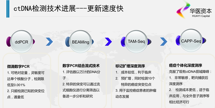 基于目前ctDNA相对成熟且临床证据较丰富的情况,可以积极参与投资,目前的检测平台一般为二代基因测序与数字化 PCR,靶向捕获+二代测序将是一个方向,另外三代测序也是重要方向。