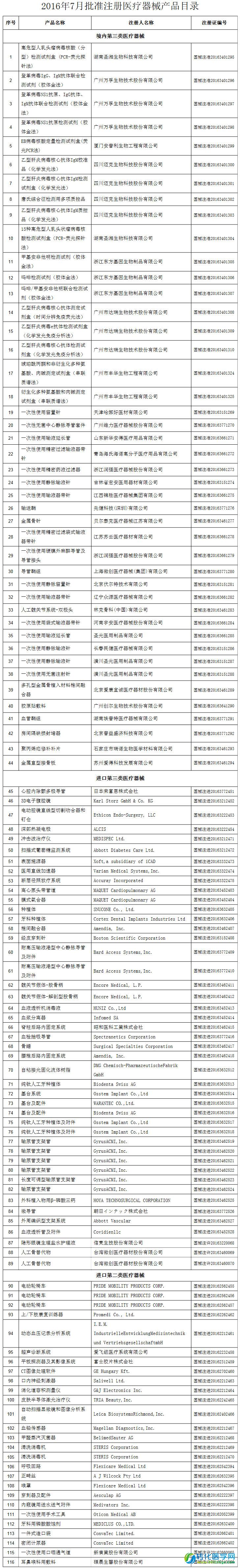 2016年7月,国家食品药品监督管理总局共批准注册医疗器械产品116个。