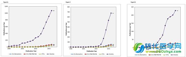 从研究视角来看,循环生物标志物的这部分目前是让人们极为感兴趣的方向,以及胞外囊泡或外泌体具有生物标志物运载体的潜能。我们希望了解该部分相较于其它循环生物标志物的发表刊物相对出增长量。图6展示了外泌体的文献发表量。