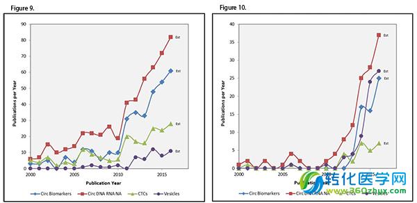 如图9所示,循环游离核酸受到的影响最大,这亦让我们深刻地了解到qPCR在这领域作为一个重要的技术平台。图10说明了RNA-Seq对于不同类别循环标志物的影响。我们的数据显示,除了循环肿瘤(CTCs)外,其它三类循环生物标志物大大地渗透到了RNA-Seq领域。确实如此,大量的研究关注循环的游离核酸和表征囊泡里的RNA载体。应该注意的是外泌体和胞外囊泡研究中的标志物大多数是RNA载体。