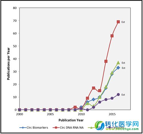 我们在PubMed网站上采用了多种关键词的不同组合进行了全面的检索,并建立了如图1所示的发表文献数据库。检索记录的多少反映了该研究方向的文献发表量;这个数据库包括的文献发表在2000-2016年。每一个类别循环标志物在PubMed上的文献发表量的增长率如图2所示。