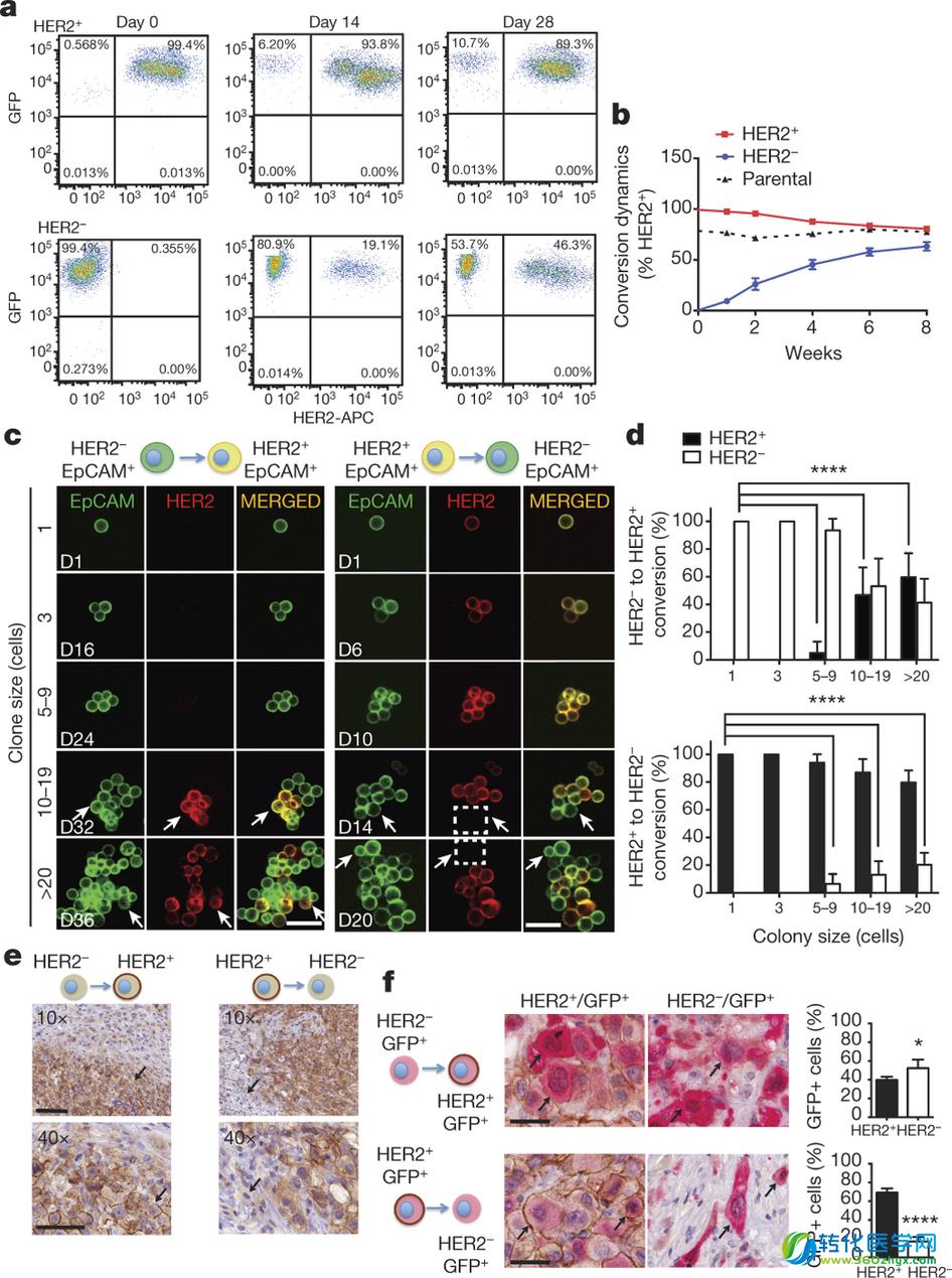| 导读 | 根据一项最新的研究,人类表皮生长因子受体2(HER2)阴性的乳腺癌细胞,可以自发地转变为循环HER2阳性细胞亚型。这一发现对治疗不同分子特征的肿瘤具有很好的价值。 |