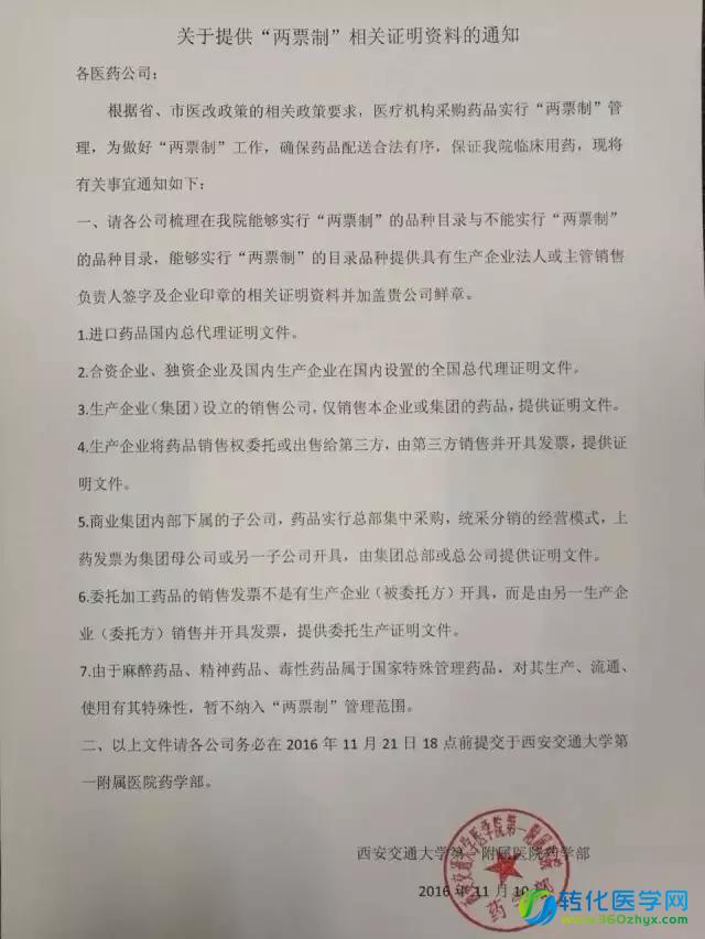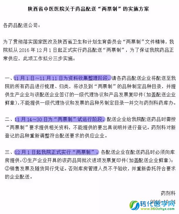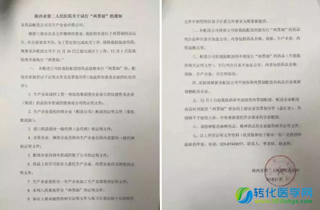 自从10月17日陕西省卫计委正式公布《关于深化药品耗材供应保障体系改革的通知》后,意味着陕西省两票制政策落地。《通知》要求,自2017年1月1日起,陕西全省城市公立医疗机构药品耗材采购实行“两票制”,在确保基层药品供应保障基础上,县、镇、村医疗卫生机构适时推行“两票制”。不少医院执行力很强,近期纷纷发出本院两票制落地的通知。