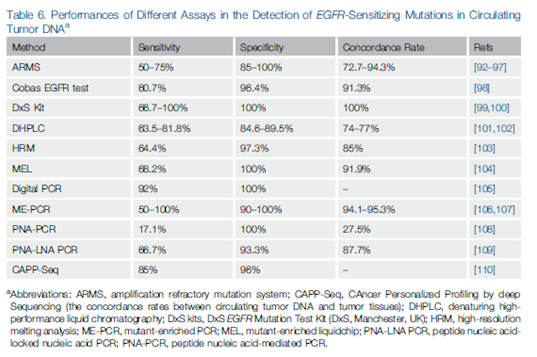 EGFR基因突变的ctDNA检测已获得临床的认可,并写入我国首个非小细胞肺癌血液EGFR基因突变检测中国专家共识中。关于ctDNA的检测方法五花八门,检测准确性参差不齐,敏感性和特异性浮动较大(图5)。ARMS技术特异性高,但敏感性还有待进一步提高;数字PCR和NGS敏感性和特异性高,但仍需要继续积累技术经验及临床数据。