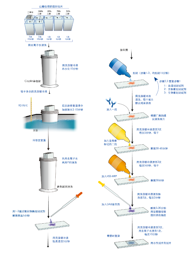 IHC特有步骤,因甲醛固定组织会造成目标表位内部或表位与附近无关氨基酸的交联、表位构象或电荷的改变,这可能导致目标表位被掩盖,阻碍抗体的结合。