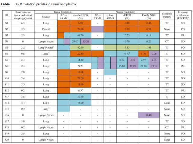 该项研究共入组20例中晚期初诊或治疗期的非小细胞肺癌患者,分别针对这些患者的每一份外周血样品,同时采用上述四种方法开展EGFR的突变检测。相应地,对于血样匹配的肿瘤组织样品,也采用了ADx-ARMS和NGS检测技术进一步明确患者的EGFR突变类型。