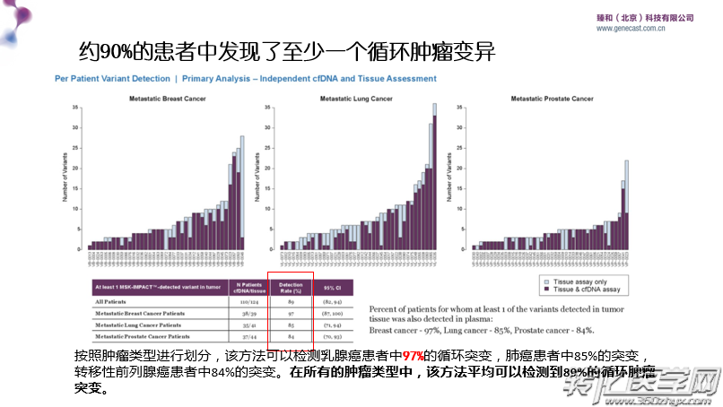 1. 大部分病人(约90%)在组织中测到的变异至少有一个在其血浆cfDNA中也能测到。