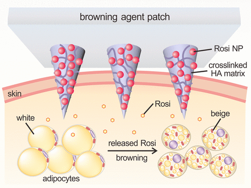 研究人员已经将这种贴片在肥胖的小鼠身上进行了测试。装在纳米颗粒中的化合物是rosiglitazone(Avandia)或β-肾上腺素受体激动剂(CL 316243)中的一种。这两个化合物的作用都是促进褐变。科学家在每只接受治疗的小鼠下腹的两侧贴了两种贴片:一种贴片的纳米颗粒中含有药物,另一种贴片的纳米颗粒中不含药物(简称“空贴片”)。每3天更换一次新贴片,共持续4周。