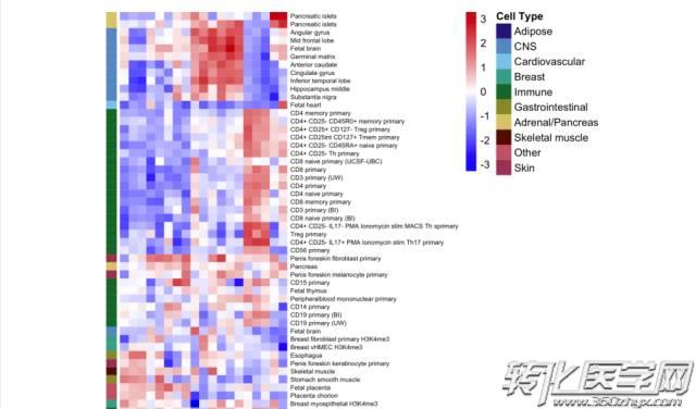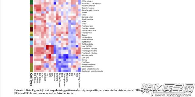 Heat map showing patterns of cell-type-specific enrichments for histone mark H3K4me1 in all breast cancer types,ER-positive and ER-negative breast cancer as well as 16 other traits.