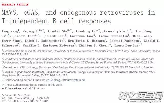 | 导读 | 10月27日,最新一期Science杂志编辑部发布了一则撤稿声明,撤稿声明显示,2011年诺贝尔生理学或医学奖得主、德克萨斯西南医学中心教授Bruce Beutler及其合作者2014年在Science杂志上发表的题为“MAVS, cGAS, and endogenous retroviruses in T-independent B cell responses”的一文因为后续的数据重复问题,在Bruce Beutler主动告知了Science杂志后对该文进行撤稿处理。撤稿声明还显示,该论文的第一作者Ming Zeng以及共同第二作者Xiaolei Shi仍然表示他们的实验结果没有问题而不同意撤稿,他们认为这是因为实验设计造成的问题。非常值得注意的是,著名的华人生物学家、美国科学院院士陈志坚(Zhijian J. Chen)教授在该论文也有署名。 |