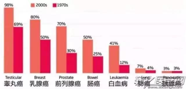 1970年和2000年美国癌症患者5年生存率