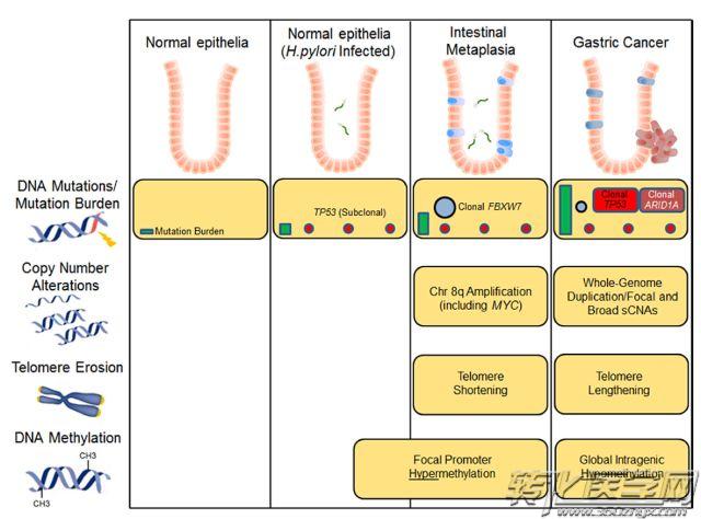 研究发现,与GC相比,IM具有较低的突变负荷,其表现为反复发生某些肿瘤抑制因子(FBXW7)的突变,而不是其他的(TP53,ARID1A)的突变,染色体8q扩增和端粒的缩短。与组织病理学(11%-27%)相比,测序鉴定出更多患有活动性幽门螺杆菌感染的IM患者。几个IMs在DNA甲基化时表现出高甲基化谷峰; 然而,IM通常缺乏晚期恶性肿瘤的基因内低甲基化的特征。 缩短端粒和染色体改变的IM患者与之后的不典型增生或GC相关; 相反,呈现类似正常表观基因组模式的患者与衰老相关。