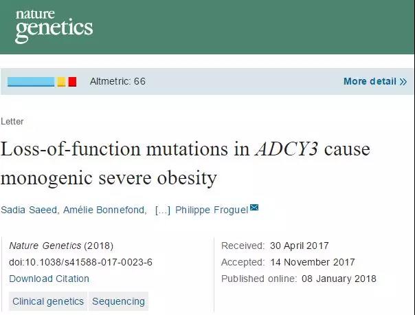这项新的研究由伦敦帝国理工学院牵头,并于1月8号发表在《Nature Genetics》上,题为“Loss-of-function mutations in ADCY3cause monogenic severe obesity”。这篇文章发现:在研究人群中,有超过30%的肥胖和ADCY3基因的隐形突变有关。