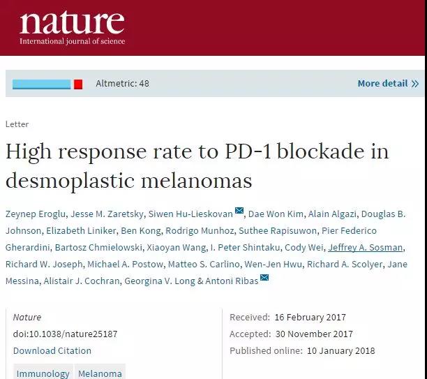 参考资料:Zeynep Eroglu, Jesse M. Zaretsky, Siwen Hu-Lieskovan, Dae Won Kim, Alain Algazi, Douglas B. Johnson,Elizabeth Liniker, Ben Kong7. High response rate to PD-1 blockade in desmoplastic melanomas.