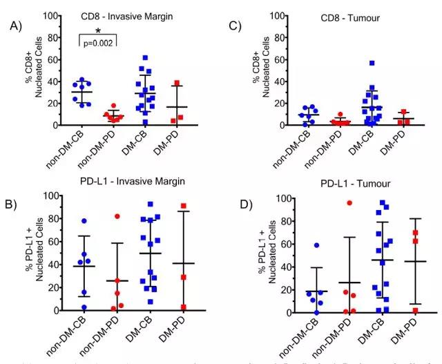 DM和非DM患者肿瘤实质和侵袭边缘的CD8密度和PD-L1表达