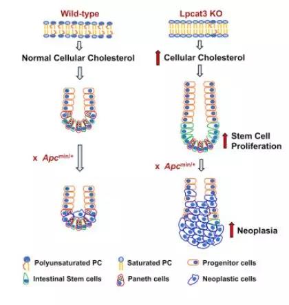 两项研究结果都显示,随着动物体内胆固醇水平的升高,它们的细胞分裂的速度更快,这导致它们的肠道组织扩张,肠道也随之延长。这些变化显著加快了结肠肿瘤形成的速度。