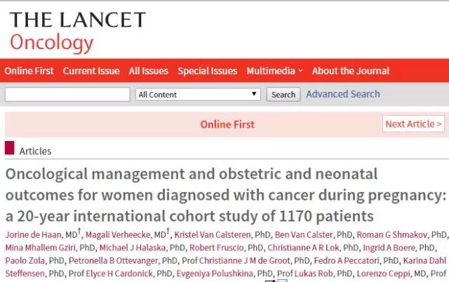 而在今年1月24日发表在《The Lancet Oncology》上面一篇名为“Oncological management and obstetric and neonatal outcomes for women diagnosed with cancer during pregnancy: a 20-year international cohort study of 1170 patients”的文章则为我们带来了研究的最新进展。这应该是目前规模最大、时间最长的相关研究。