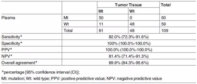 血浆与组织配对标本中EGFR突变状态比较(N=109)