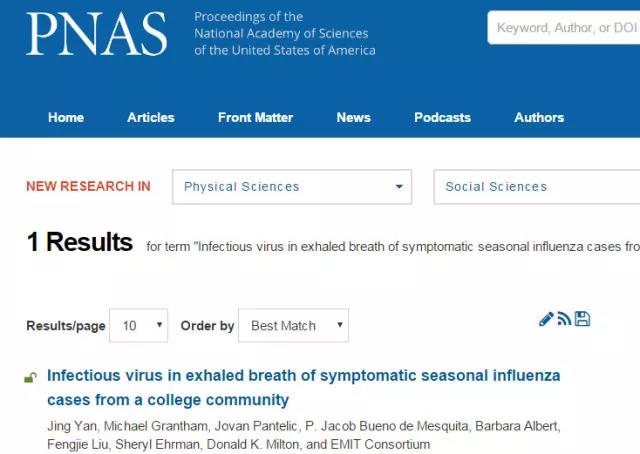 在美国国家科学院出版的杂志《PNAS》上发表的一篇名为“大学社区有症状的季节性流感病例呼气中的感染性病毒(Infectious virus in exhaled breath of symptomatic seasonal influenza cases from a college community)”的文章提供了经空气传播的新证据,因为研究者在流感患者呼出的气体中发现了大量的传染性病毒。