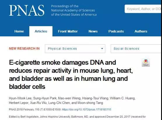 该研究以《E-cigarette smoke damages DNA and reduces repair activity in mouse lung, heart, and bladder as well as in human lung and bladder cells》为题发表在2月份的《PNAS》上。
